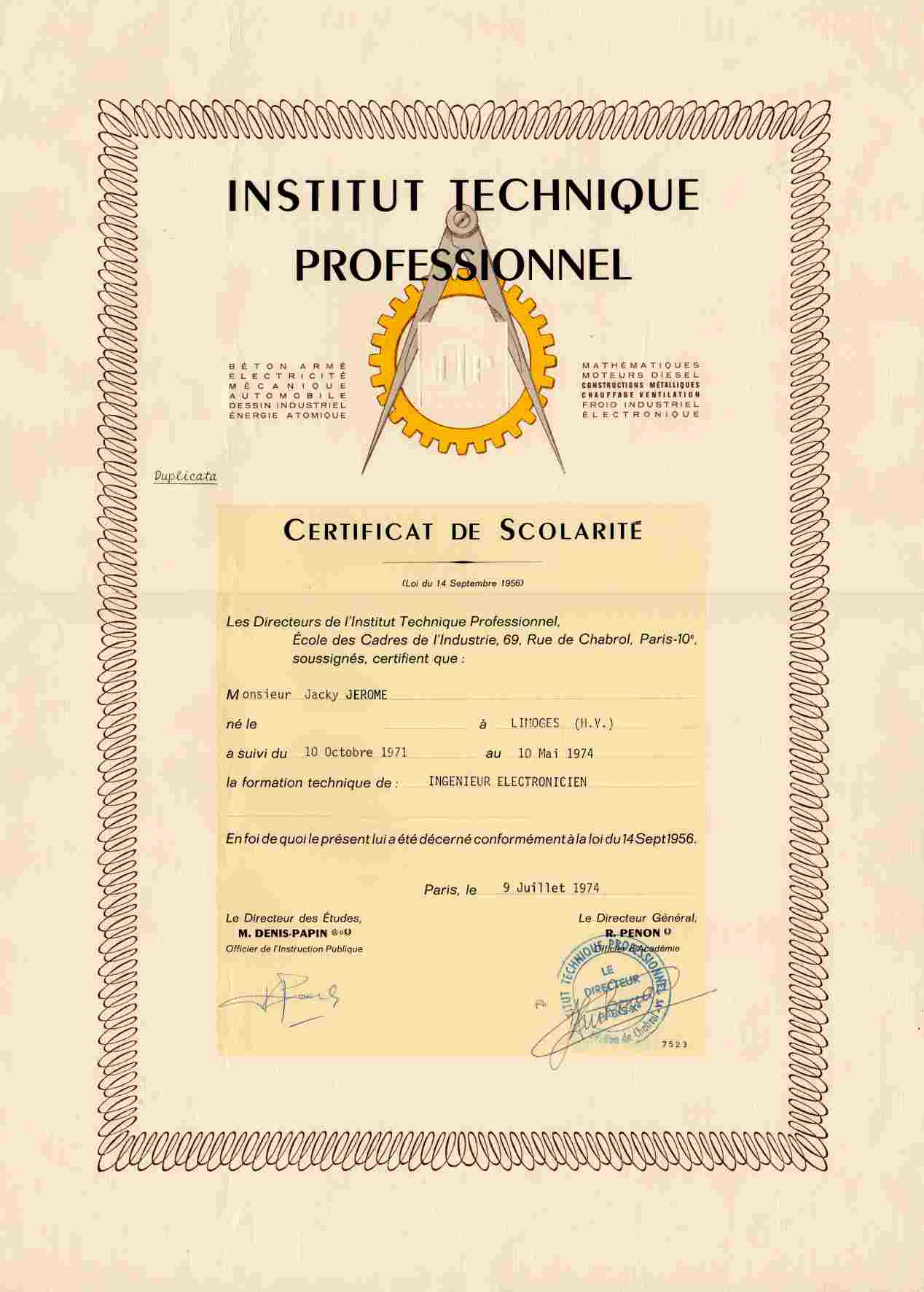 Certificat de formation d'ingénieur électronicien délivré par l'Institut Technique Professionnel - Ecole des Cadres de l'Industrie.